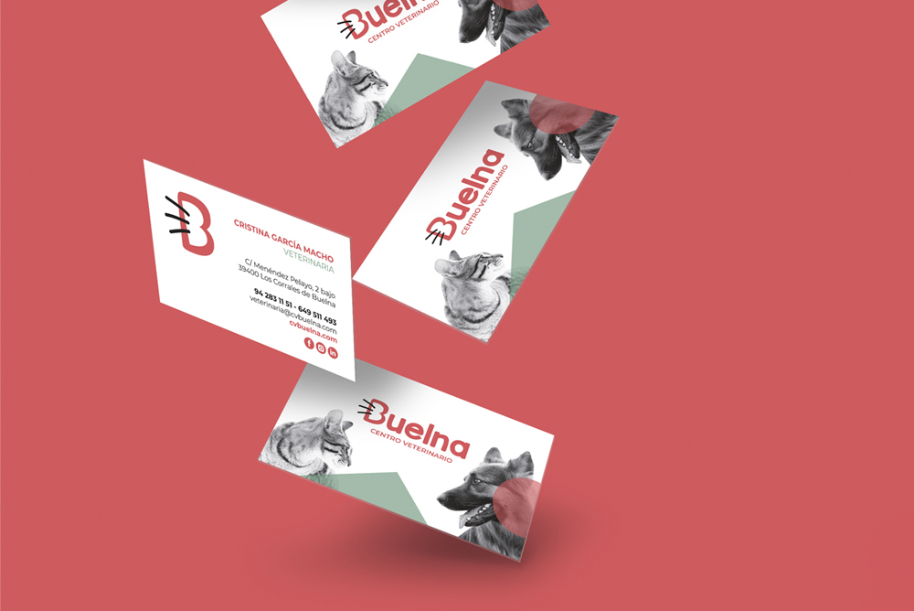 Buelna Centro Veterinario es una marca con mucho «corazón» y la posicionamos como un lugar amable y poco intimidante, lo cual es vital para los dueños de mascotas que suelen ir con ansiedad. Con un imagotipo donde el símbolo está integrado en la propia tipografía creando una identidad compacta. Usamos tres trazos negros a la izquierda convirtiendo la letra «B» en una síntesis de la cara de un animal. El trazo es manual y desenfadado. No busca la perfección geométrica de una clínica hospitalaria fría, sino la calidez de un centro veterinario de trato cercano. Hemos optado por un color nteresante y poco convencional para veterinarias (donde suelen reinar el azul o el verde). Este tono comunica empatía, calidez y amor. Se aleja de la estética puramente médica para acercarse a una estética de «cuidado y hogar».
