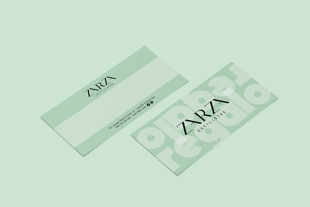 Aquí estamos ante una identidad que respira sofisticación, vanguardia y un toque de exclusividad. La nueva marca de Zaraza Estilistas, es una identidad basada puramente en la letra, lo cual es tendencia en el sector del lujo y la belleza. Utilizamos una fuente con una modulación muy marcada (trazos muy gruesos que se encuentran con trazos muy finos). Este contraste es el código visual universal de la elegancia y la moda. Las letras «A» no tienen el travesaño horizontal completo, sino una pequeña muesca o línea flotante, de esta manera le quitamos peso a la letra, la hace más aérea y moderna, evitando que el logo se vea «pesado». El fondo es un verde menta desaturado o «verde salvia». Es un color que comunica calma, frescura y naturaleza, pero con un aire renovado y moderno. La combinación con el negro puro le da un rigor profesional. Transmite que, aunque el ambiente sea relajado (verde), el trabajo es de alta precisión (negro).